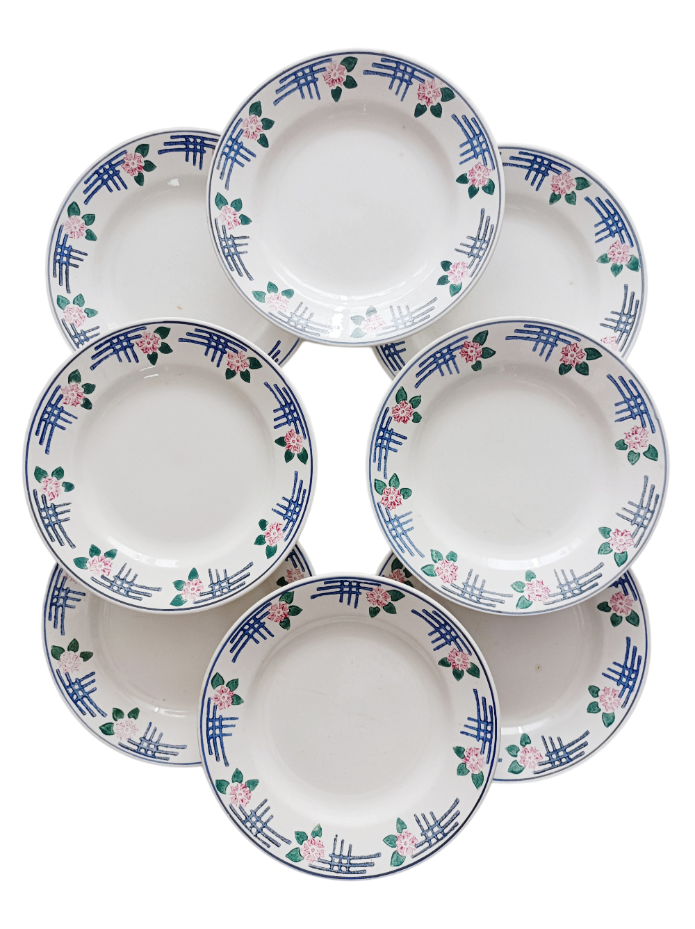 Lot de 7 assiettes plates Badonviller, décor treillage
